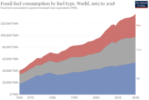 A real surprise emerging from this research was the comment by Michael Mann, one of the world’s most respected and outspoken climate scientists (not associated with this research): _‘_The good news is that it doesn’t appear we’re headed on that trajectory [to a largely uninhabitable planet] now, given the progress already being made world-wide in transitioning away from fossil fuels.’ Really?? That’s not my reading of the situation – see the graph below demonstrating still increasing fossil fuel consumption. It doesn’t matter what promises are made by corporations and governments; it doesn’t matter how much renewable energy we install; until fossil fuel consumption approaches zero, greenhouse gases will keep accumulating in the atmosphere and global temperatures will keep increasing.