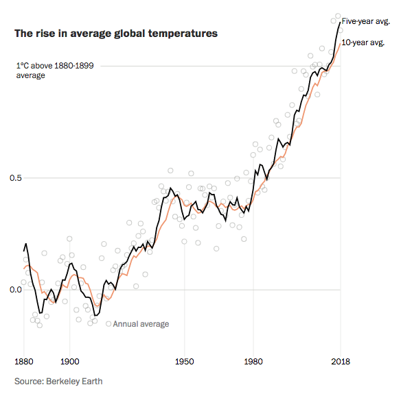 The warming trend is 1.2°C at moment, based on 5-year running average, and 1.1C° based on 10-year running average (see figure below).
