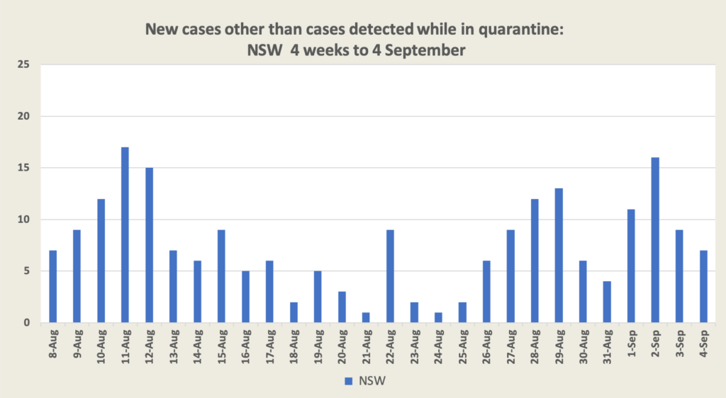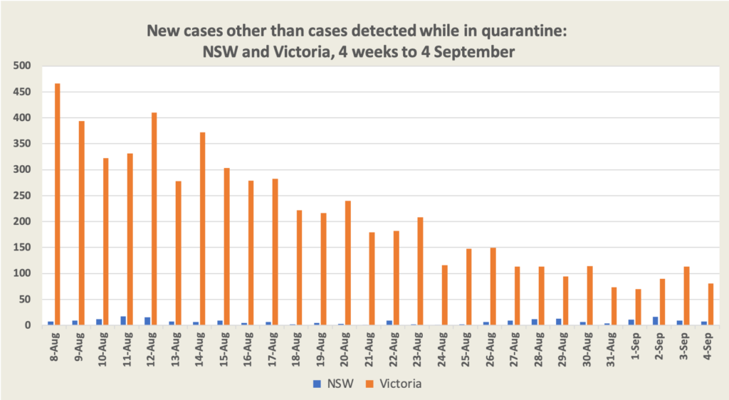Duckett and Mackey are critical of the idea that we can manage with some steady “manageable level” flow of cases, pointing out that such an approach is dangerous and economically costly. Commenting specifically on that strategy as it is being played out in New South Wales, they warn that “the longer the virus is in the community, the greater the risk of breakouts requiring lockdowns to be reimposed to prevent hospitals being overwhelmed. That’s a ‘yo-yo’ strategy – the economy could be seized with uncertainty as businesses open, close, open, and close again”. Each new case has the potential to grow into a Victoria-style outbreak that can be managed only with extreme measures.