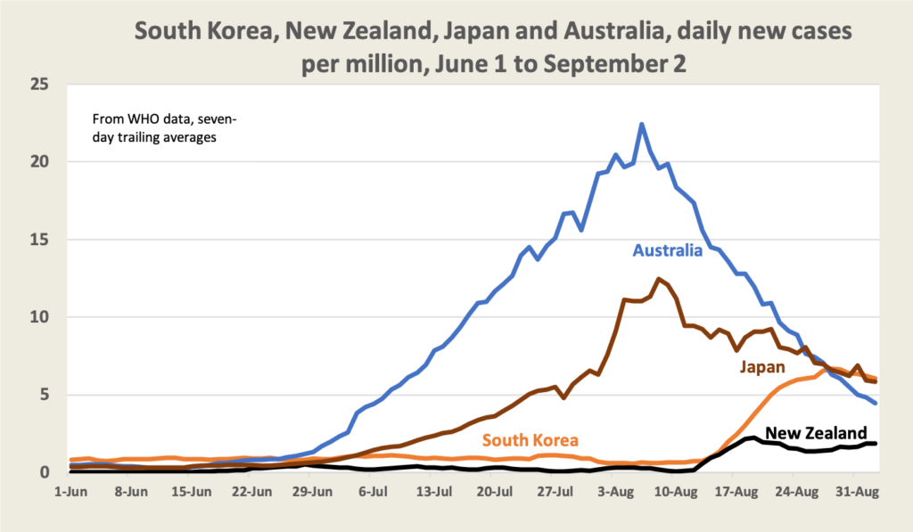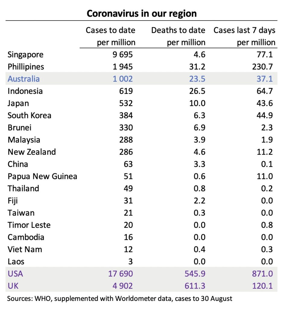 The table below, ordered by the total incidence of cases per million population, gives a statistical snapshot of the virus in our region. At the bottom of the table, providing some perspective, are comparative figures for the USA and the UK – countries with which we often compare our performance on matters of public policy. They’re in another, more chaotic, world.