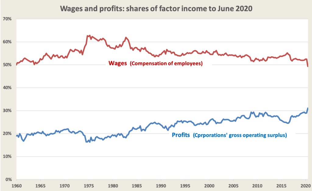 One notable development is that wages have fallen sharply as profits have risen. Not too much should be read into such data for one quarter: many people have lost their jobs, and government transfers such as “Jobkeeper” have passed through corporate accounts. But of more interest from a policy perspective is the trend in the shares going to labour and capital, well before there was any sign of Covid-19. Are any of the Coalition’s policies intended to reverse the trend?