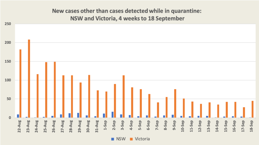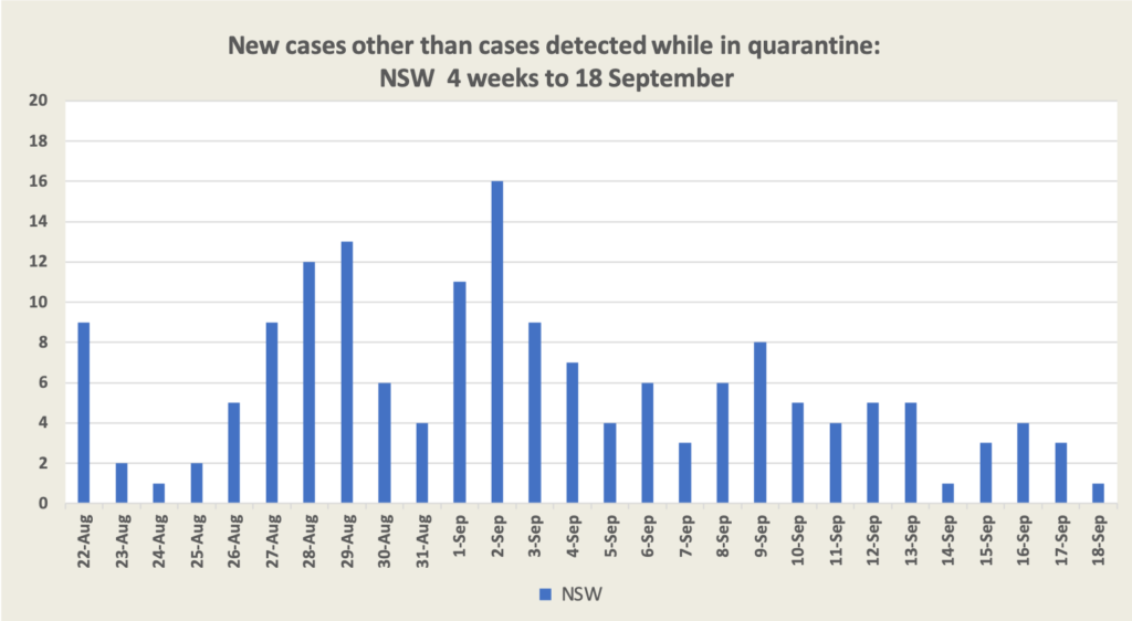 Even though it is not explicitly going for elimination, New South Wales is doing well. Of its 47 cases last week, 25 were returned travellers in hotel quarantine, and of the other 22 only 3 have not so far been traced. There is a risk that the Berejiklian Government may embarrass Morrison by effectively eliminating the virus.