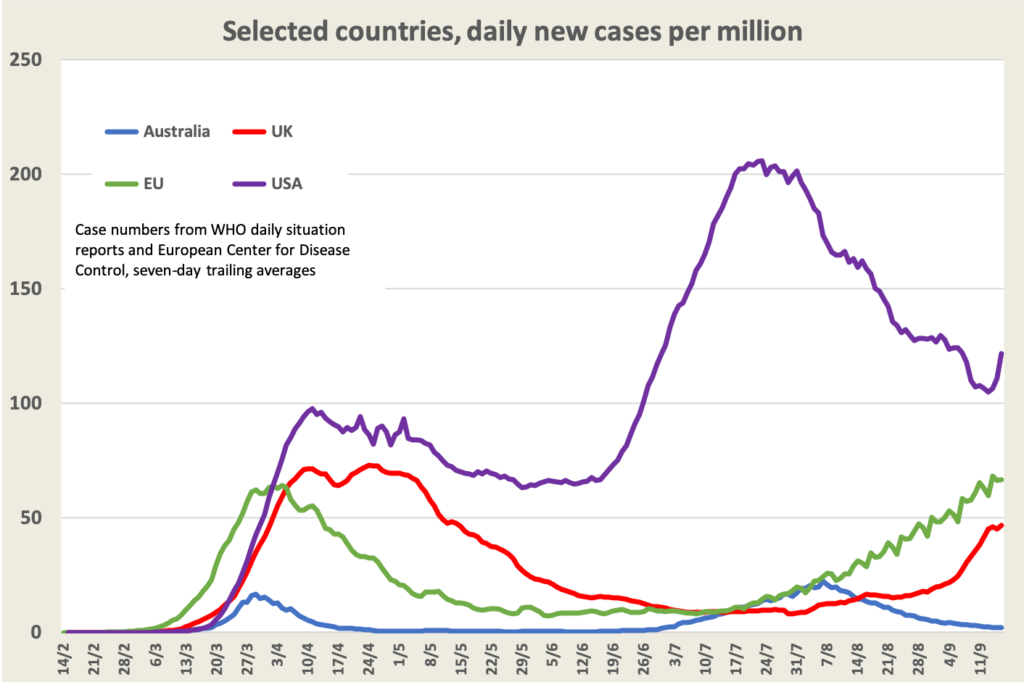 Victoria’s criteria for relaxing controls are tough. Melbourne can expect a substantial relaxation after late November when there are no new cases for 24 days, for example, and they can expect a Western-Australian type almost normal life if there are no active cases and no new cases for 28 days.