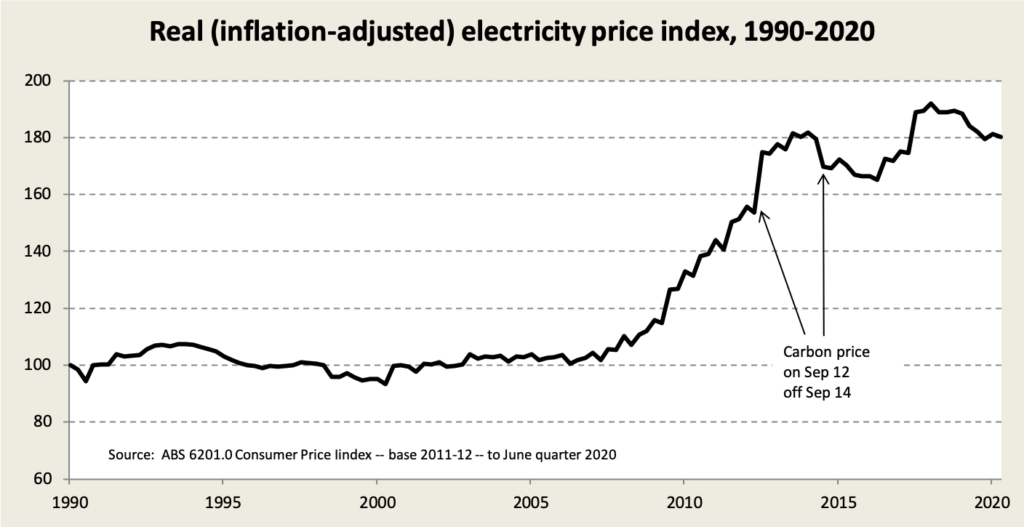 Morrison and his backers keep harping on about electricity prices. We should remember that only 25 to 30 per cent of your electricity bill is for the electricity generator – the coal, wind, gas etc plant. The rest pays for getting it from the power plant to our home or business. Electricity prices, which had been stable in real terms for decades, started to rise around 2005. Some of this was because of necessary capital investment, but much of it has been as a result of the inefficiencies and over-compensation in the National Electricity Market. And as shown in the graph below, Labor’s short-lived carbon price had much less impact on prices than the NEM “reforms”, and in spite of recent minor falls, the price of electricity is still higher than it was during the carbon price period. Morrison’s concern about prices is hypocritical.