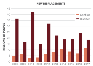 The histogram below is taken from the _Global Peace Index 2020. Measuring Peace in a Complex World_ (page 73). It clearly demonstrates that for every year since 2008 the number of people displaced by natural disasters has exceeded the number displaced by conflict. The totals displaced in the 2008-2017 period were about 250 million by disasters and 70 million by conflict. Natural disasters have more than tripled since 1980, with storms and floods leading the way. The report estimates that by 2050 climate change will create an additional 140 million migrants in sub-Saharan Africa (86 million), South Asia (40 million) and Latin America alone as water availability and agricultural conditions deteriorate and food insecurity (already a problem for a quarter of the world’s population) increases. By 2050, 27% of countries will experience catastrophic water stress and 22% catastrophic food stress. Countries and regions that are developing economically and have high population growth and low levels of ‘Positive Peace’ (attitudes and institutions that create peaceful societies) are most at risk of threats posed by droughts, floods, sea level rise and possibly conflict (‘Negative Peace’).