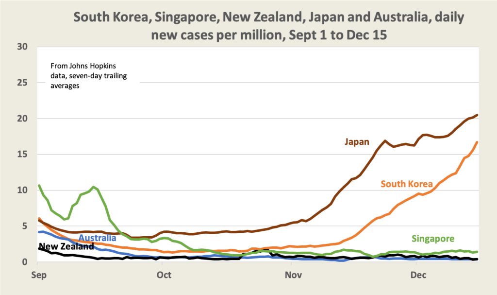 For a time there was talk about a travel bubble among developed Asian countries, Australia and New Zealand, but there have been outbreaks in Korea and Japan. In those countries the rate of new cases is well below the rates prevailing in the USA and Europe, but they are rising quickly. There is speculation about what has caused the surge in these two hitherto very successful countries: maybe it’s down to complacency, maybe it’s the winter-time effect as is being seen in Europe.