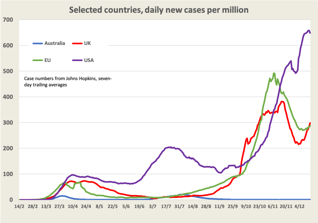 As expected, cases have surged in the USA. A great deal of publicity has been given to America’s consequent surge in deaths; but the UK and Sweden, two European countries that have been less than rigorous in preventing a winter wave, are not far behind. Over the week to 15 December the average daily death rate in the USA was 8.7 per million people, while in the UK it was 7.5 per million and in Sweden it was 8.3 per million.