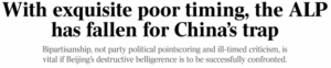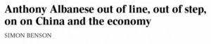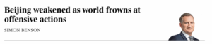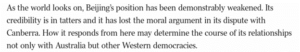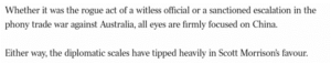 In reality, how much substance was there to these comments from the journalists? “Few world leaders agree”; “Countries across the world”; “The diplomatic scales have tipped heavily in Australia’s favour”; and “Beijing’s position has been demonstrably weakened”. Opinions or, more accurately, hopes presented as fact. Surely that’s propaganda.
