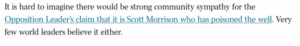 Wow. The international community really seems to be getting behind Australia. Simon Benson assures us that few world leaders believe Scott Morrison to be at fault. A shame none is mentioned. Latika Bourke says “Countries across the world are showing significant support for Australia”.