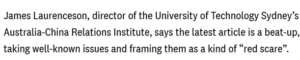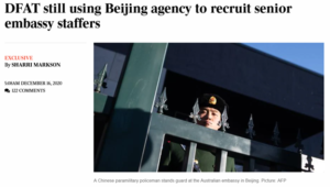 Devine and Markson were the only two journalists to report on this “story”. But that didn’t stop another editorial from The Australian: but no outrage expressed at the fact that DFAT is still using a Beijing agency to recruit staffers. And nary a China expert in sight among the fear-mongering.