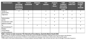 The hierarchy of incumbency benefits at the federal level is presented in Table 1 (see below), showing it is not just parties in government that benefit from access to state resources. Rather there are diverse political actors competing on the playing field, with incumbents having an advantage over challengers such as parties not represented in parliament.