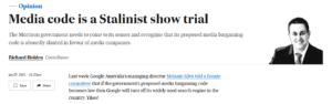 It also published an article attacking the Morrison government’s draft media laws that would force tech giants Google and Facebook to pay news organisations for sharing their content.