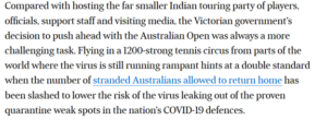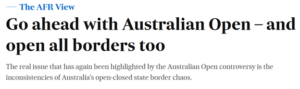 The Financial Review made my job easy this week. First there was the (once again) conflation of responsibilities, apparently criticising the Victorian government for flying in 1200 tennis players, officials and entourages. This missed the fact that Tennis Australia is footing the bill for the entire exercise, while the responsibility for getting home stranded Australians lies with the federal government, not Victoria.