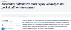 The Australian Financial Review reckoned ordinary workers won’t mind getting no pay increases for the forseeable future (friendly reminder - Australian billionaires have seen their wealth increase by 50% during 2020).