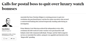 Contrast this with the calls for Christine Holgate to quit after giving out $20,000 in watches as a bonus – a bonus approved by the board, following a highly profitable year.