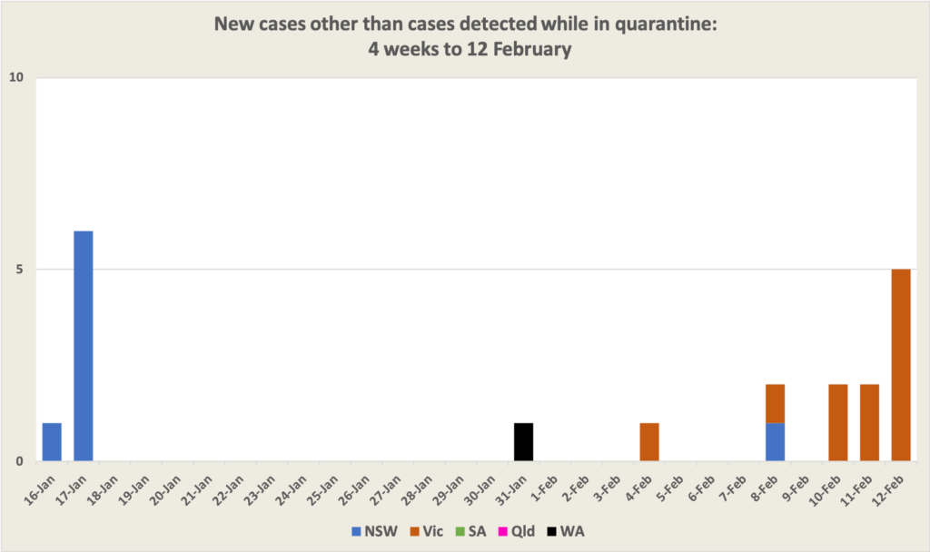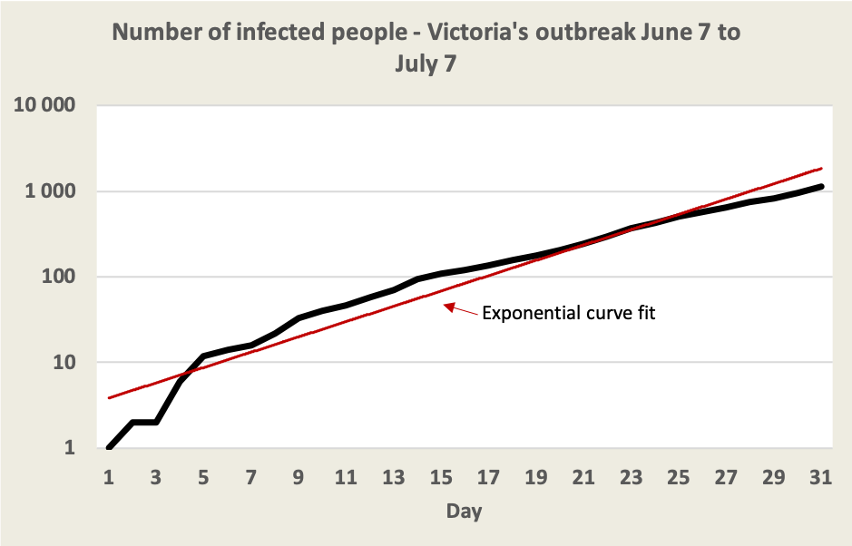 That’s a valid point, but we should be wary of the “just one case” idea. As a reminder, below is a chart of what happened in Victoria in June last year – note the logarithmic scale. On June 6 there were no recorded cases, on June 7 there was one case. The rest is a story of exponential growth, until it started to be checked about three weeks later (where the black line dips below the red trend line), at massive cost to the state and the nation. With at least 13 cases in the current outbreak Victoria is already a fair way along that line once again.