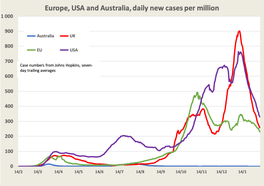 Here are the usual curves for Europe and the USA. Infection rates are well on the way down, particularly in the USA and Britain. It is possible that after all its delays and procrastinations, at this stage of the pandemic the UK is doing better than the rest of Europe. European Commission President Ursula von der Leyen has acknowledged that the EU could have done better in its vaccination program.