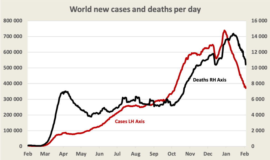 Official figures, collated by the WHO and published on reliable sites, suggest that worldwide Covid-19 cases and deaths are falling. Reported deaths lag reported cases by two to three weeks.