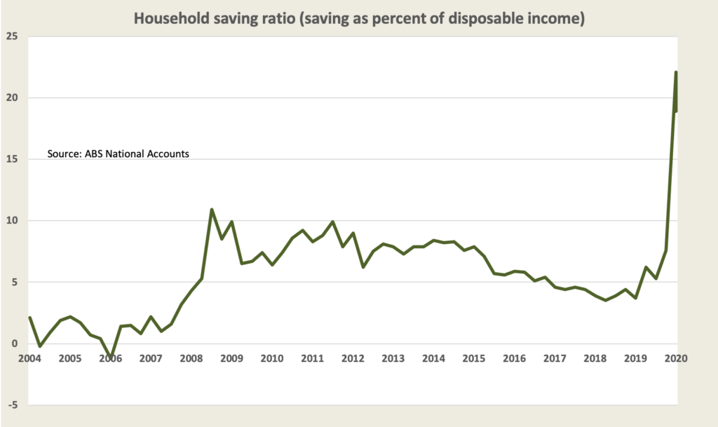 Before the pandemic Australian households had been running down their savings, but because of increased transfer payments (“Jobseeker” and “Jobkeeper” to use their Orwellian names), because of limited spending opportunities, and because of prudence, people’s savings have risen sharply as shown in the chart below.