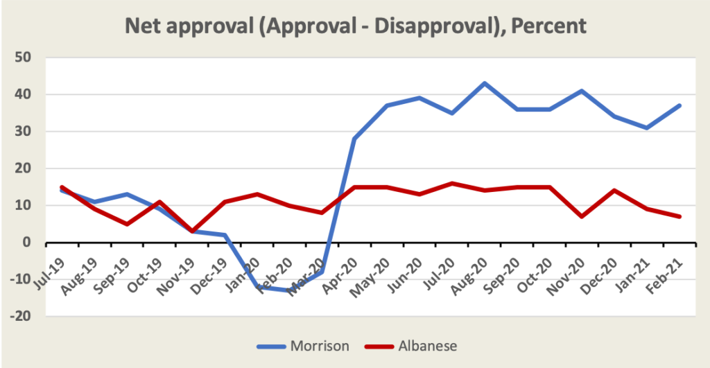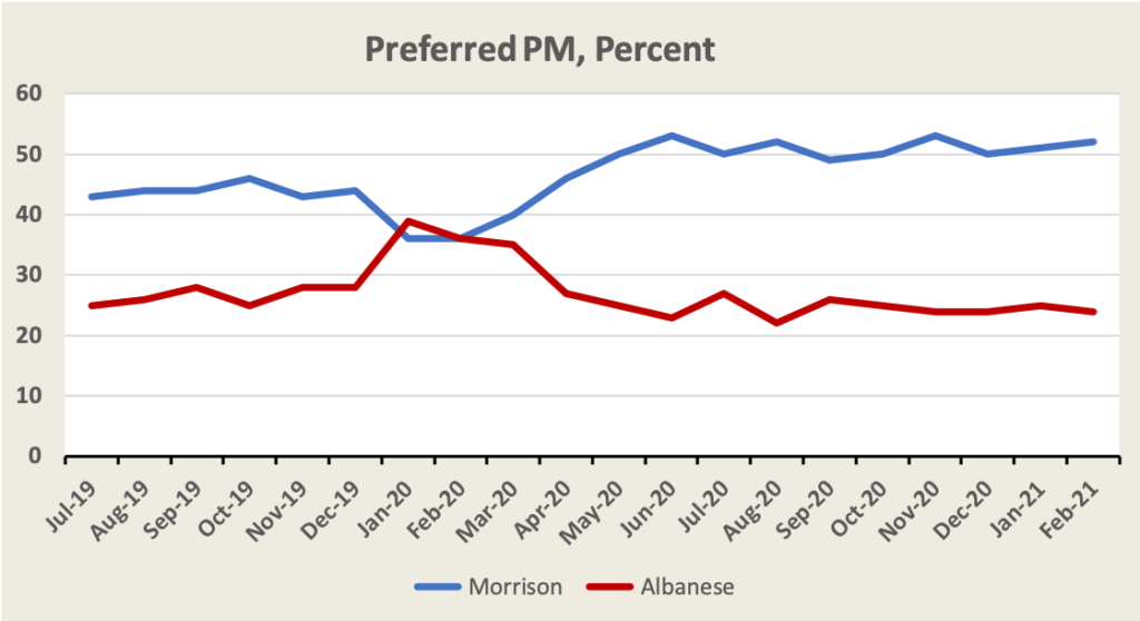 In spite of renewed revelations of corruption in grants programs, and election donation data revealing the influence of big money on the Liberal Party, Morrison has strengthened his lead over Albanese both in terms of net approval and as preferred prime minister, according to the February Essential Poll.