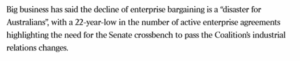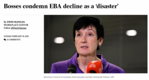Jennifer Westacott, head of the Business Council of Australia, accurately described the decline in Enterprise Bargaining Agreements as a “disaster”, but given the destruction that would be wrought on EBAs should the omnibus bill pass – as described by economists – using the disastrous decline as a reason to vote for the reform is, well, a little far-fetched.