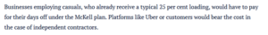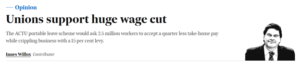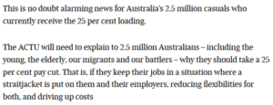 Innes Willox at the Australian Financial Review and Nick Bonyhady at The Age/SMH peddled the myth that 2.5 million casuals get a “25% loading” – in reality, half of casuals get no loading, and the average difference in pay ranges from 4% less to 5% more, compared to a permanent worker (and that’s without leave entitlements) – and instilling fears of pay cuts and higher prices.