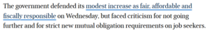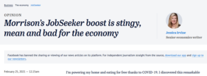 And the miserly $3.57 a day rise in JobSeeker was ‘fair and affordable’, ‘pragmatic’, and ‘fiscally responsible’. The mainstream media tripped over themselves to support the government’s line in the face of widespread condemnation from eminent economists that the huge cut to the unemployment payment rate would cost jobs and hit the recovery.