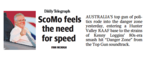 “Captain”. “Top Gun”. After Morrison walked in to the unveiling of some fighter planes to the song “Danger Zone” by Kenny Loggins – very Trump-esque at best, and that’s before you realise it took a couple of goes to get the timing right – there was some sweet material for the mainstream media to get their fill of sycophancy.