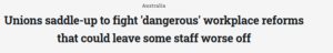 Meanwhile, Sally McManus, president of the Australian Council of Trade Unions, described the reforms as “dangerous”; Alison Pennington, senior economist at The Australia Institute, as a “kick in the teeth for Australian workers”. Sparse coverage of those statements.