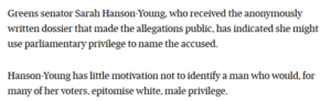 Aaron Patrick, for the Australian Financial Review, reckoned the minister’s silence was “dignified”, and that Sarah Hanson-Young was merely point-scoring on the basis of the minister being a privileged, white male.