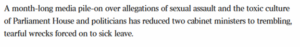 There was an outpouring of grief for the “trembling, tearful wrecks” of Cabinet Ministers forced on to sick leave, having to experience such ‘humiliating’ and ‘devastating’ claims. Some particularly callous commentary equated Porter’s life with that of the “ruined” life of the woman who died by suicide.