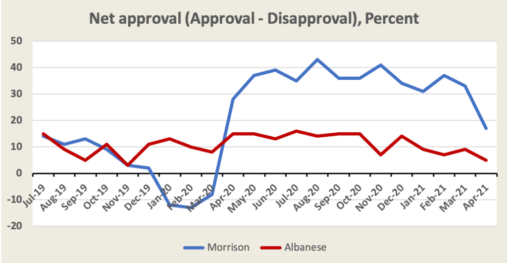 The latest Essential poll has the usual questions on approval of Morrison and Albanese and on preferred prime minister. Although the gap is narrowing, both Morrison and Albanese are down on approval.