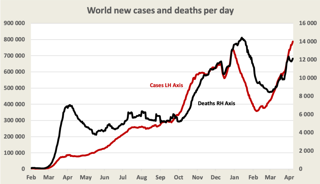 Globally the story is grim.  The WHO warns that the pandemic shows no signs of easing, and is particularly concerned by the possible emergence of vaccine-resistant variants.  (From the above link download the latest week’s report to read its special focus on risk assessment.) The WHO once again carries warnings about half-hearted attempts to suppress the virus and about lifting restrictions too early.