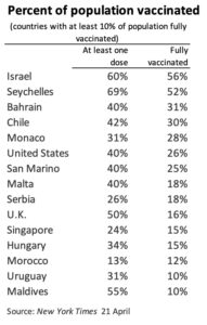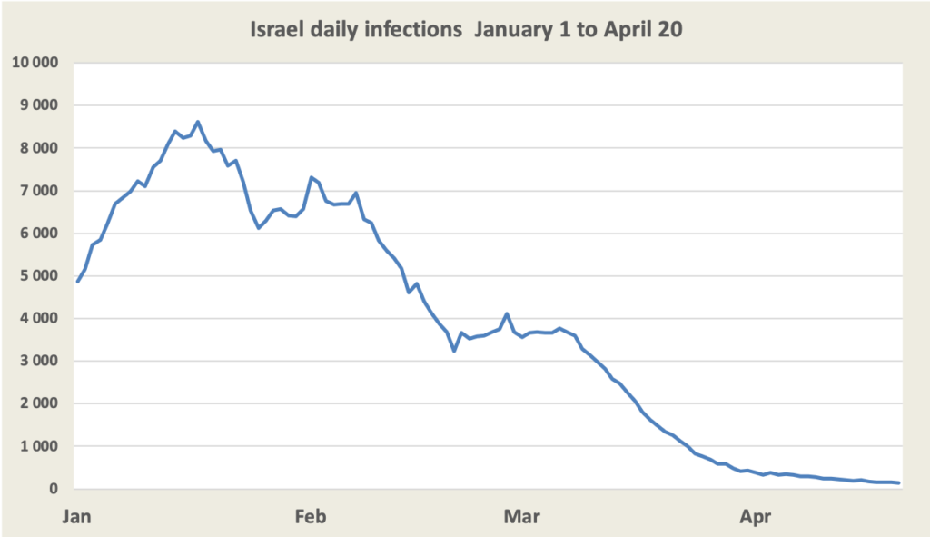 In relation to vaccination it’s far too early to make conclusions about its effectiveness. As public health experts stress, vaccination is only one factor in suppressing the virus and some countries are combining vaccination with tough restrictions. Note, for example, how in terms of infections the USA is doing far worse than the UK, even though more of its population is fully vaccinated.  But Israel’s results look promising: its daily infection rate is down to 16 cases per million as shown in the graph below.