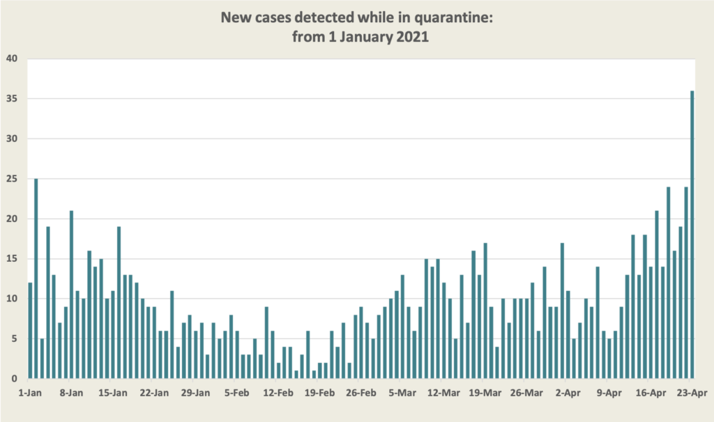 The hotel quarantine system is coming under further stress from outbreaks in particular countries where the virus is out of control. The graph below shows the number of cases detected in people in hotel quarantine so far this year: the rapid rise in cases over the last month is clearly evident.