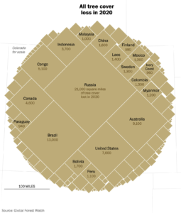 Despite the economic and consumption consequences of COVID-19, the loss of forests increased by 7% globally during 2020 (12% in the tropics), with almost 100,000 square miles (the size of Victoria plus some) of tree cover lost. Many causes were involved. Land clearing (often illegally) for crops and cattle ranching continued, while massive fires in Russia, USA and Australia, droughts and insect infestations were related to climate change. As the figure below clearly demonstrates, most of the losses occurred in Russia, Brazil, Australia and the USA. Deforestation is increasing in Brazil (where many of the fires in the Amazon were deliberately lit to clear land) and the Congo but Indonesia has been decreasing its deforestation since the disastrous human-lit fires of 2015.