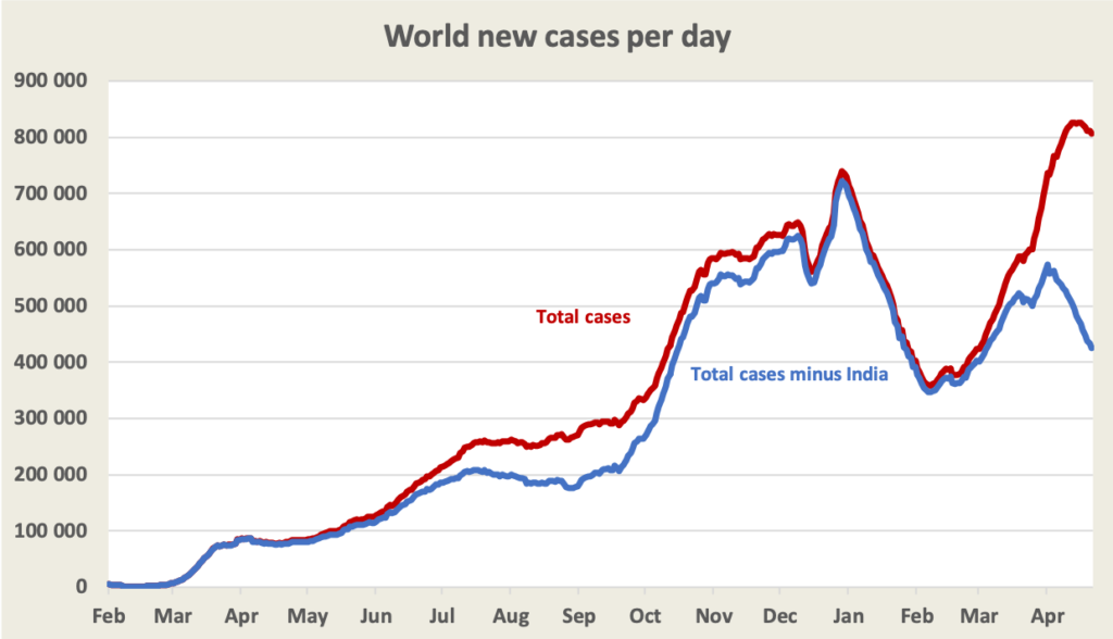 Worldwide cases seem to be falling again, with the notable exception of India, as shown in the graph below.