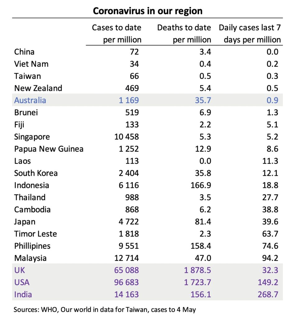 Domestically all attention is on an outbreak in New South Wales, well-covered in the media. The cases have been traced to a traveller from the US, pointing to a failure in that state’s border controls. As Norman Swan reports, people of New South Wales are remarkably lax about Covid-19: any outbreak in that state could spread rapidly, and the state is dealing with a large proportion of arrivals with Covid-19 – 115 of Australia’s 262 cases in the two weeks to May 6.