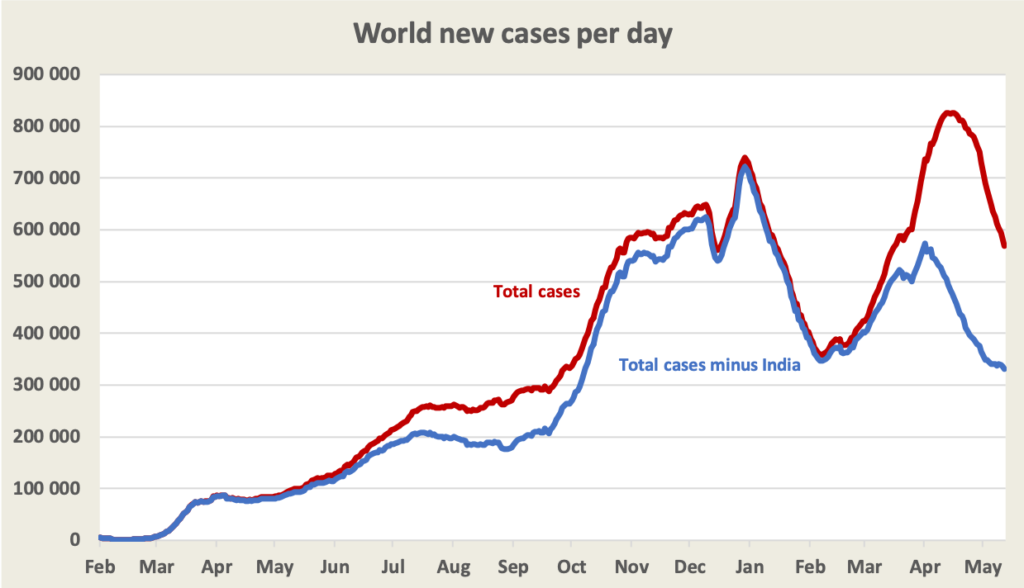 World reported cases are shown in the graph below, with a separate line showing cases in the world other than India.