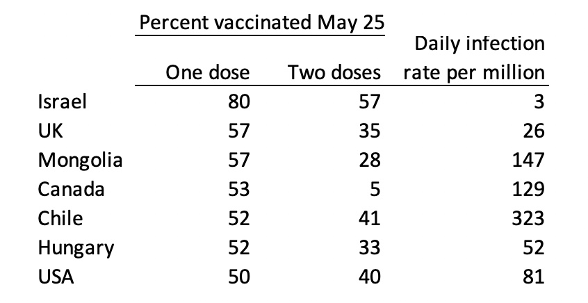 As yet, however, there is no clear relationship between vaccination and the incidence of cases. Some countries, such as Uruguay and Bahrain, have high case rates and high immunisation: this may be because high immunisation has been in response to high rates of infection. The table below shows vaccination and daily cases for countries that have achieved at least 50 per cent one-dose vaccination, excluding small island countries.