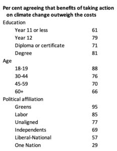 Just on three-quarters of us believe that “the benefits of taking further action on climate change will outweigh the costs”, but on this question there are significant differences based on education, age and partisan affiliation, with agreement levels shown below: