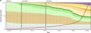 The figure below may help you make a little more sense of this. The white, grey and blue bands at the bottom represent Wildlands; the brown and green bands different sorts of Cultured anthromes (drylands and woodlands); and the bands at the top different sorts of Intensive anthromes (buff-orange=rangelands, yellow=croplands, and purple-blue-red=settlements). The red line plots population growth. Basically, rangelands, croplands and settlements have gradually replaced (already inhabited) drylands and woodlands as the global population increased, and this process has accelerated in the last 150 years. But there wasn’t much Wildland left 12,000 years ago and it’s decreased only a little since.