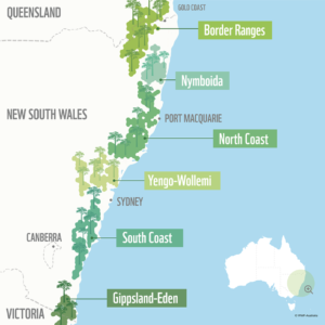 As well as killing and displacing billions of vertebrate and invertebrate animals, Australia’s east coast 2019/20 bushfires converted many forests into drier woodlands, shrublands and grasslands. The low rainfall, extreme temperatures and increased lightning associated with continued global warming will further increase the frequency and intensity of bushfires and put remaining forests at even greater risk. The Environmental Defenders Office and WWF are seeking government support to use existing legislation and stronger regulations to protect 1.4 million hectares of critical unburnt bushland in six landscapes from the Queensland-NSW Border Ranges south to the Gippsland-Eden area on the NSW-Victorian border. The emphasis is on restricting land clearing on private land and native timber harvesting on both public and private land to protect wildlife habitat and threatened species. This will also protect the ability of forests to store carbon and generate rainfall. Empowering local communities to get involved is an essential part of the strategy.