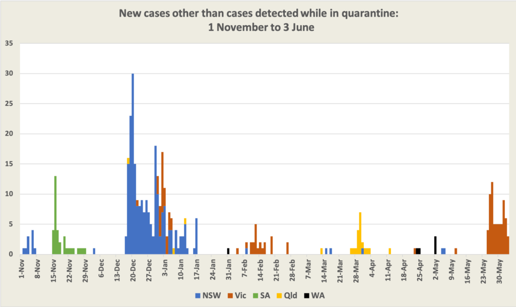To put recent outbreaks in perspective we have prepared the graph below, showing community cases in the seven months since November (when the big Victorian outbreak was finally overcome). Each has stemmed from a failure in our external borders. Each has been costly, not only in terms of the restrictions governments have imposed, but also in terms of the way any outbreak at this stage has a chilling effect on personal and business plans.