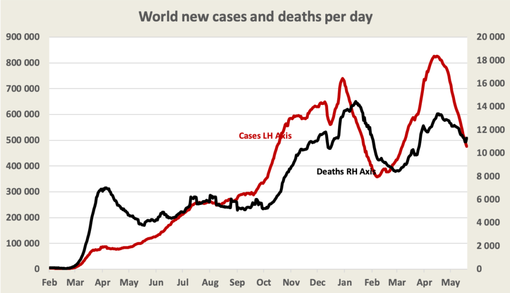 The global reduction in daily cases is attributed mainly to falls in Europe, the USA and India. In South America and Africa cases are rising and on both continents there may be significant under-reporting. It would therefore be folly to draw too much meaning from the steep fall shown in the graph.