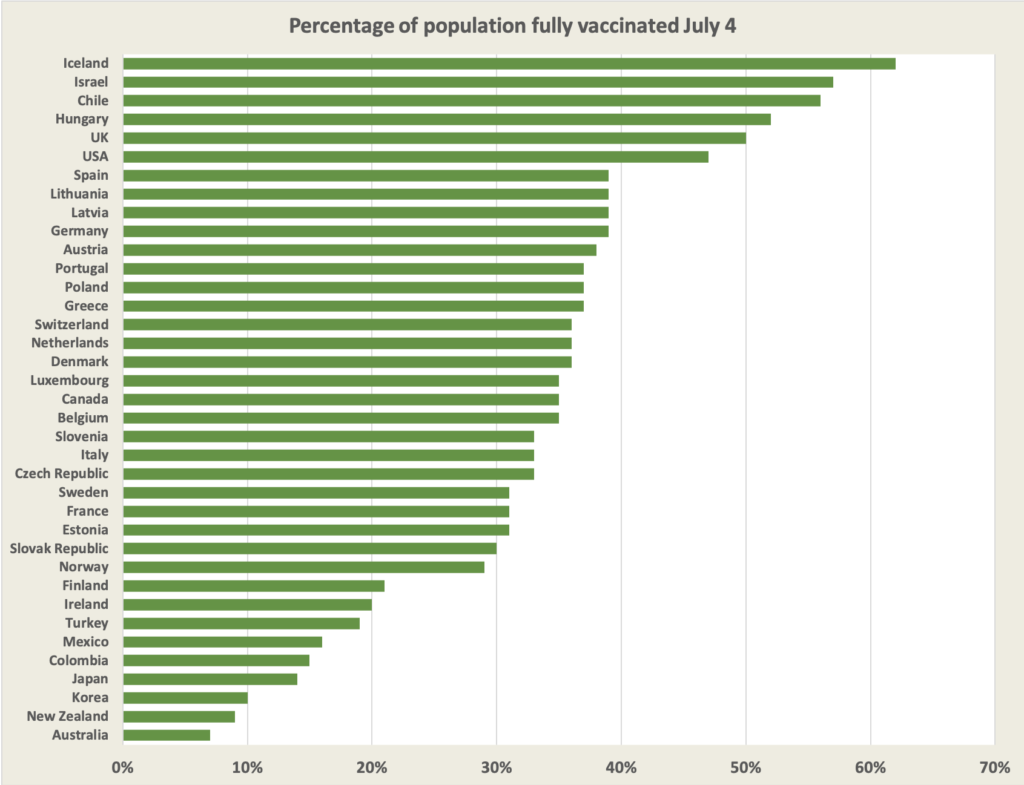 Two charts tell most of our story. First, a comparison of vaccination rates in OECD countries as at early July.