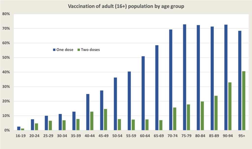 Second, vaccination by age group in Australia. There is a long way to go before all the green lines reach up to the top of the chart – the 80 per cent that is around most epidemiologists’ estimates of the herd-protection level. If we had reason to trust the Allocations Horizons plan (a ghastly name!) we could make a good estimate about when we will get there, but there is a veil of secrecy around the Commonwealth’s plans; even the deal with AstraZeneca is classified as a national security secret.