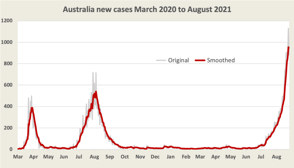 In theory the harsher restrictions and rising levels of vaccination should be starting to take effect, but if they are taking effect they are being offset by some other force, possibly a reduced effectiveness of contact-tracing: see Allan Saul’s comments above. Our basic curve-fitting identifies a state-wide growth rate of 5.9 per cent daily (that means cases double every 12 days). Saul, who has done some small-region analysis, identifies a higher rate of infection growth in regions where the base number is low, suggesting that rather than responding to the virus’s growth rate, the New South Wales Government is obsessed with high numbers where the virus is established. (Think of firefighters who put all their resources into a big blaze while ignoring spot fires in areas with heavy fuel loads.)