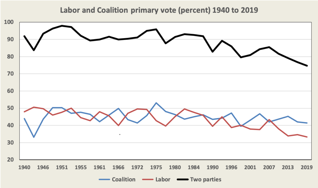 This is a manifestation of a 70-year slide in the combined Coalition plus Labor vote – a slide that has picked up pace in the last 30 years.