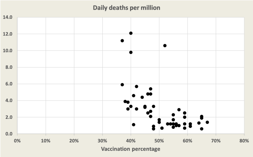 Another reader suggested we look at the USA, a natural experiment with 50 states which have vaccination levels ranging from 37 per cent to 67 per cent of the population (67 per cent is just a bit higher than our 80 per cent of the adult population). We plotted deaths against vaccination and found a clear pattern: